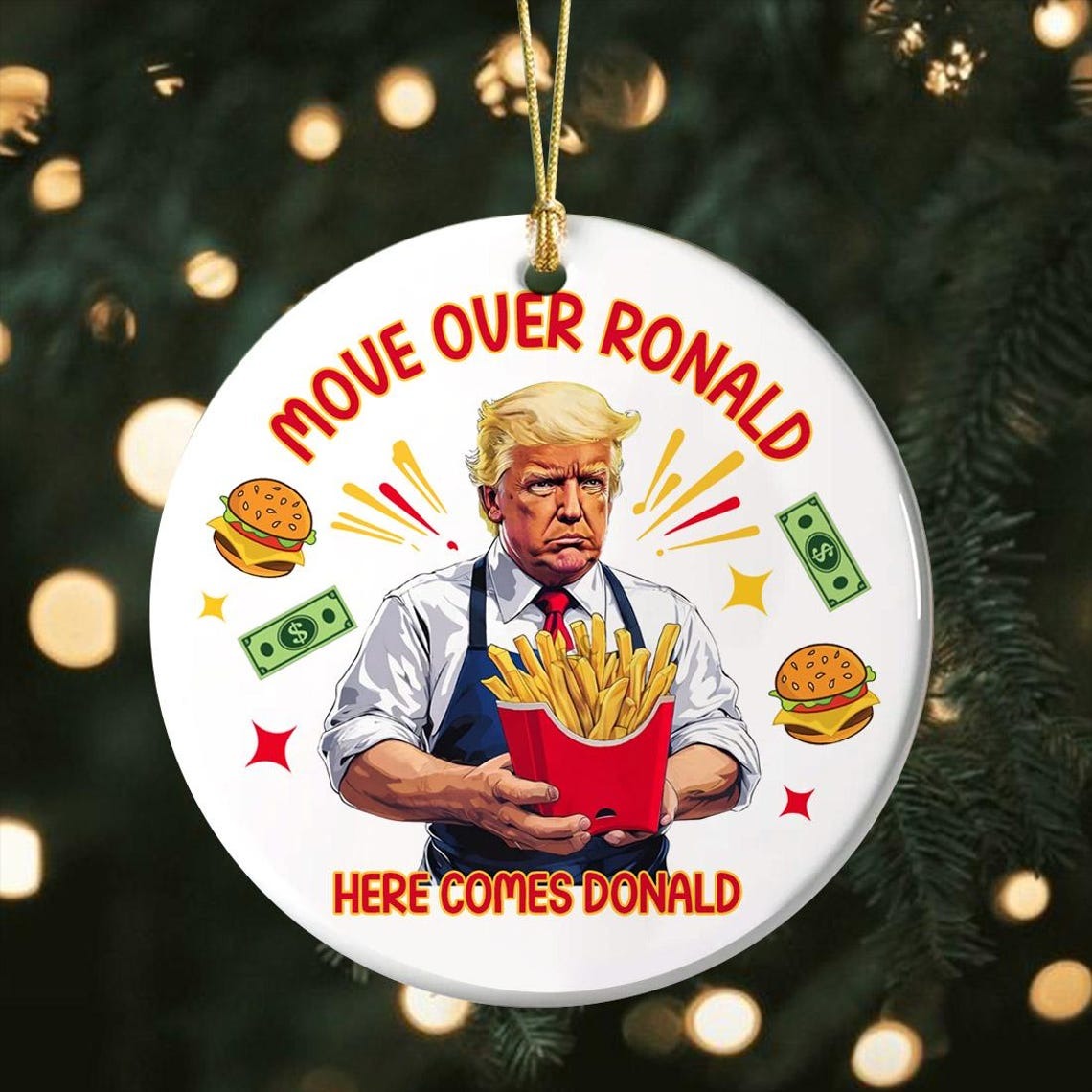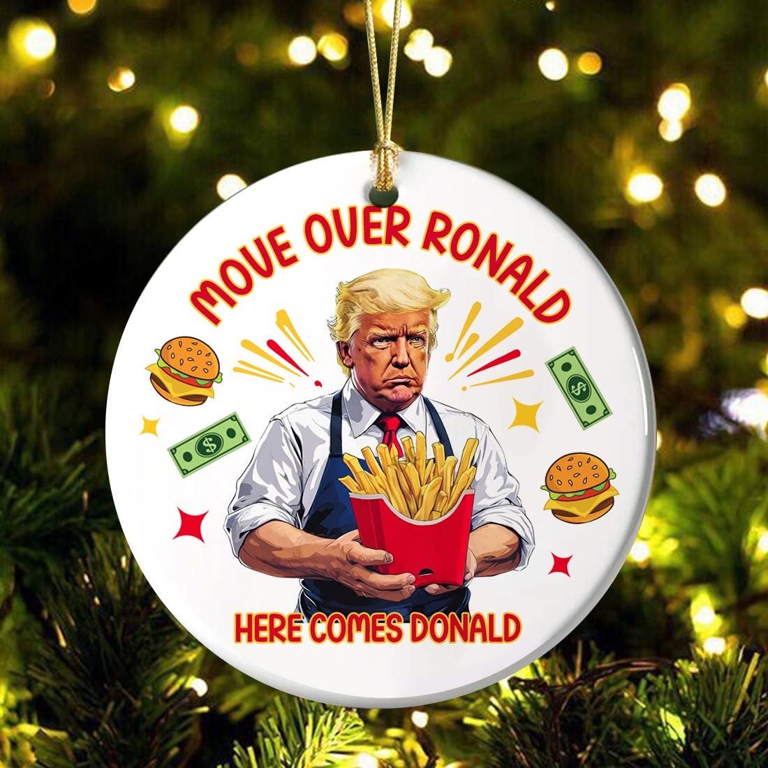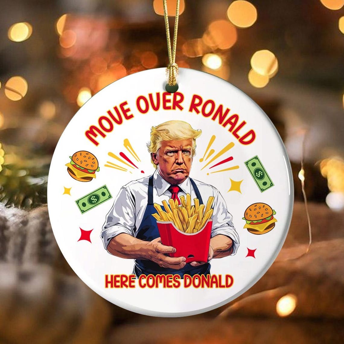 - Packaging: Gold metallic string, red ribbon and jute twine strings for hanging included